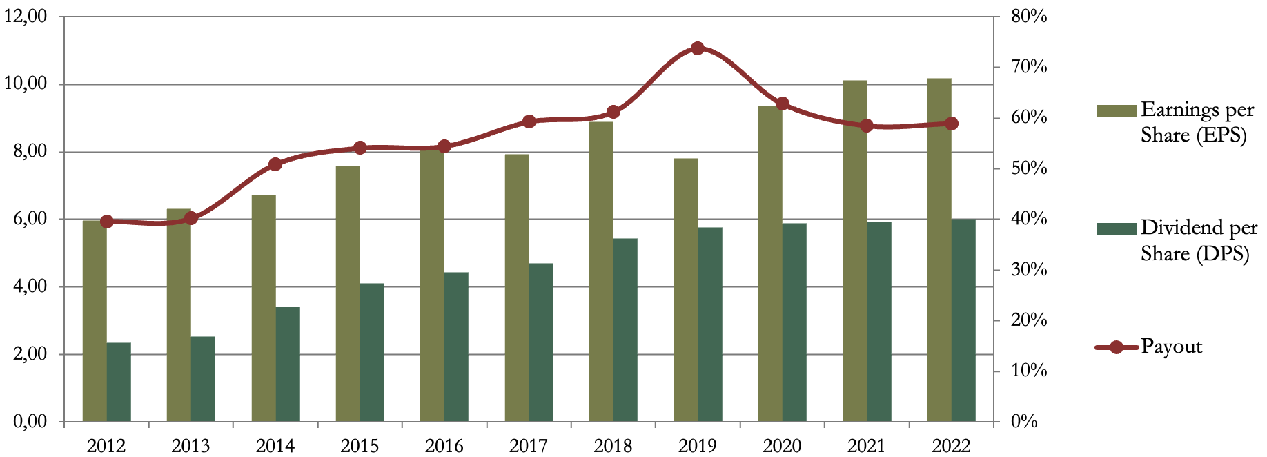 El Payout ha ido creciendo y en 2022 alcanzó el 59%, un valor todavía sostenible, pero que en los últimos 10 años ha ido aumentando progresivamente, ya que en 2012 el Payout se situaba en torno al 40%. Debemos remarcar que desde 2012 el BPA ha crecido a un ritmo del 5,5% anual mientras el dividendo lo ha hecho a un 9,8%.