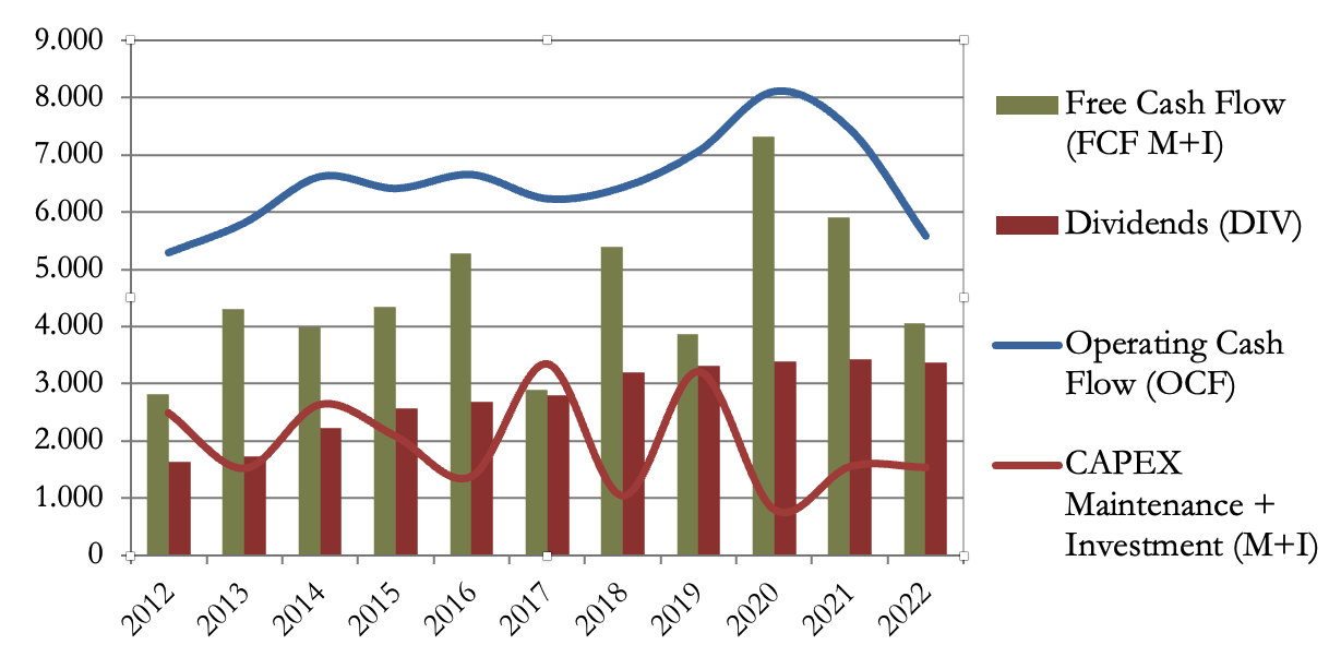 Si miramos el histórico, el Operating Cash Flow (OCF) tuvo una tendencia excelente hasta el año 2020. Ello, unido a un CAPEX de Mantenimiento prácticamente plano, permitió a 3M generar un FCF creciente y más que solvente para el pago de dividendos.