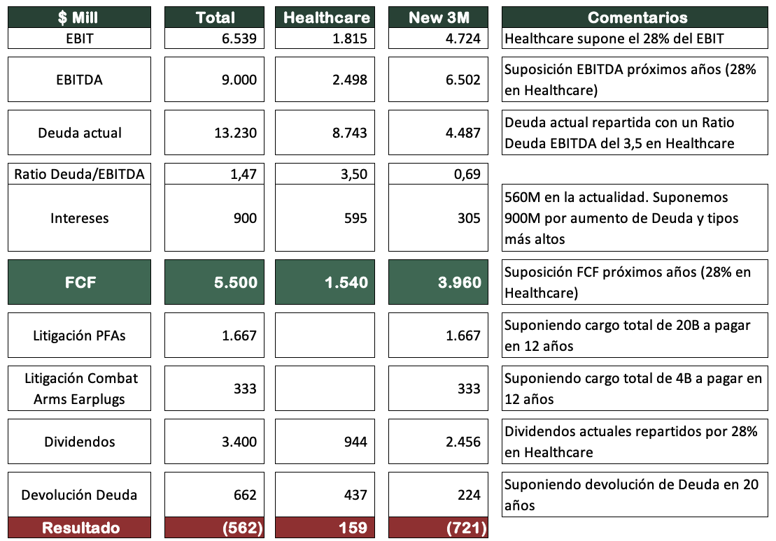 Estos datos son bastante optimistas dado que estamos estimando un FCF que podría no ser tan elevado por el aumento de intereses (especialmente en Healthcare que asumirá la mayor parte de la Deuda), y por el Guidance negativo que da 3M para 2023. Además, hay estimaciones muy superiores por el importe a pagar por el litigio de los tapones de oídos. Hemos tomado la estimación más optimista (4 billions) que es la de Morningstar, aunque hay otras muy superiores que alcanzan hasta los 10 billions o más.