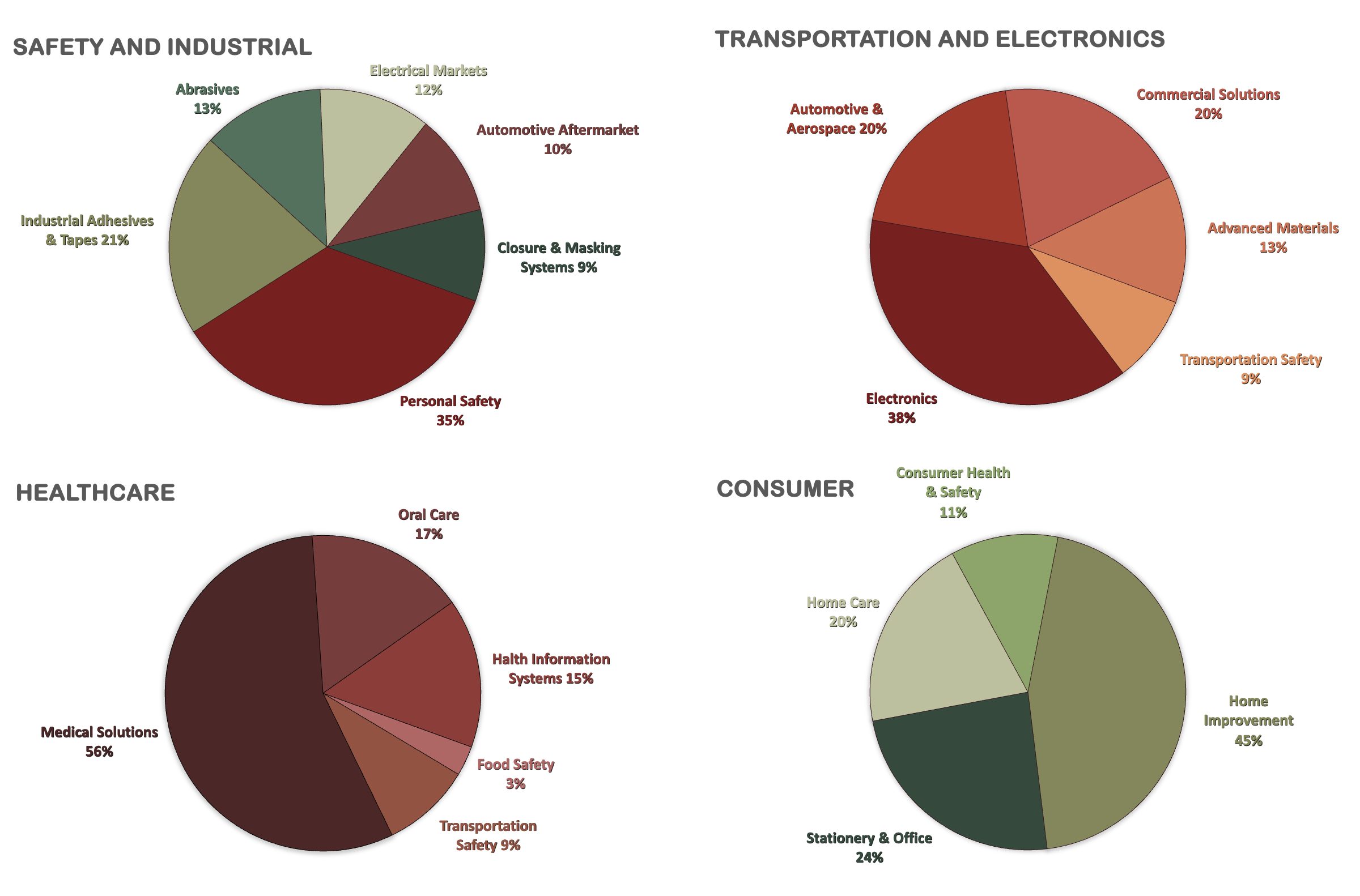 Transportation & Electronics: productos relacionados con la industria de automoción, aeroespacial, y seguridad del transporte. 3M produce desde materiales avanzados para la fabricación de vehículos de transporte, hasta aplicaciones electrónicas para procesar sonidos y consumo de energía. En este segmento también se incluyen las señales reflectantes de carretera, y muchos otros productos.
