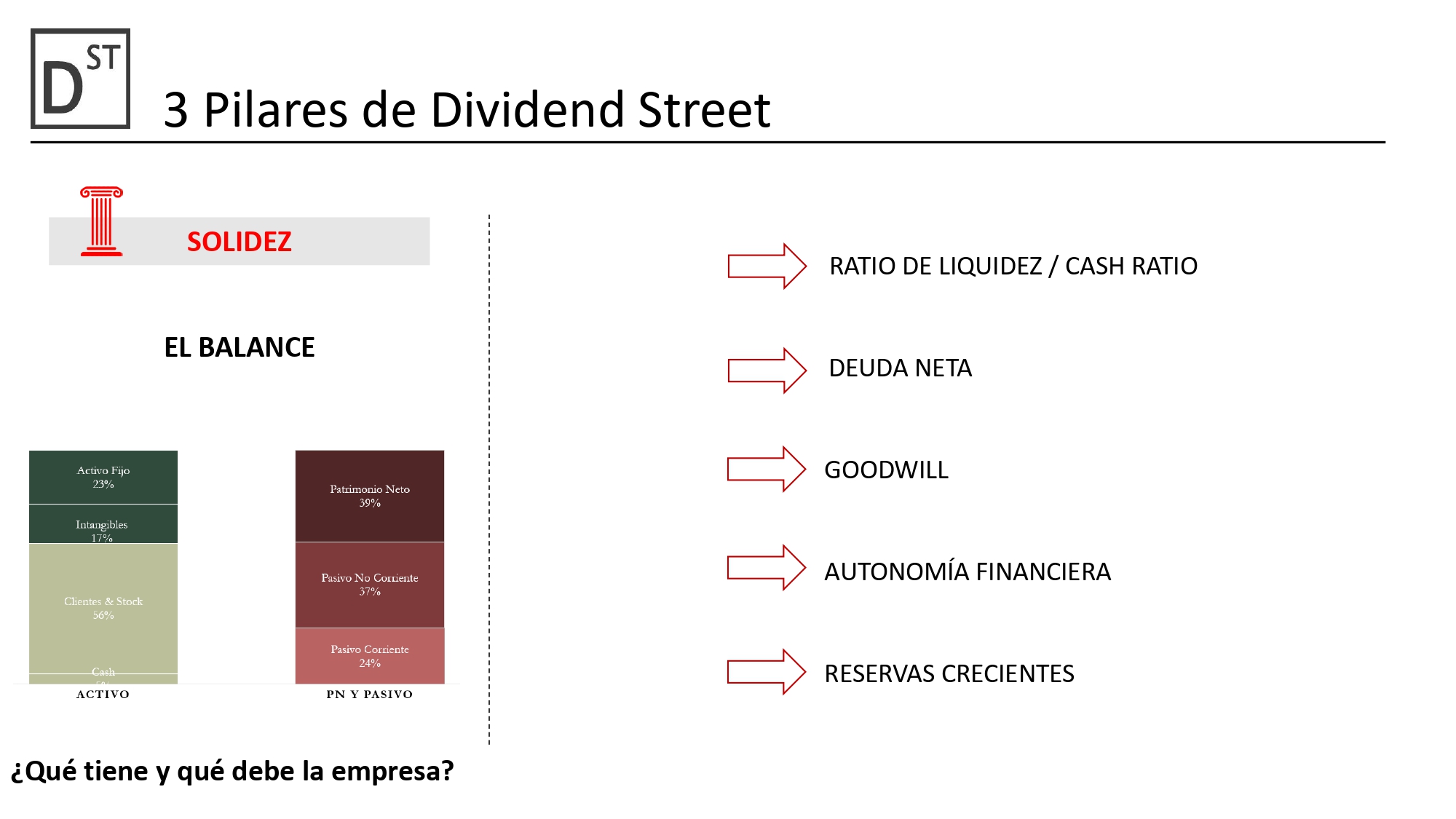 Por Solidez entendemos un Balance saneado y prudente. Aquí puede haber debate, dado que algunos dirán que esto es contrario a la rentabilidad, pero nos gusta que las empresas tengan más dinero en caja del que deben, lo que se traduce en Ratio de Liquidez alto, Cash Ratio razonable, ausencia de Deuda Neta y Autonomía Financiera alta. Es decir, que la empresa tenga muchos más activos que Pasivos. También procuramos detectar que los Activos de las empresas no se compongan en gran medida de Goodwill, y en general, que no se enmascaren debilidades.