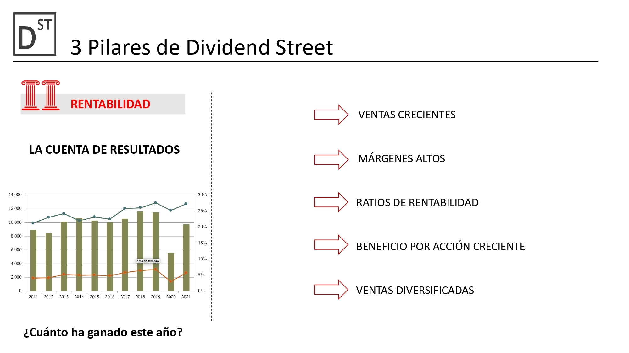 Por Rentabilidad, entendemos una Cuenta de Resultados que demuestre que la empresa consigue maximizar sus beneficios con su negocio. Buscamos empresas que tengan Ventas crecientes, Beneficios crecientes y que dicha Rentabilidad sea alta respecto a la composición de su Balance.