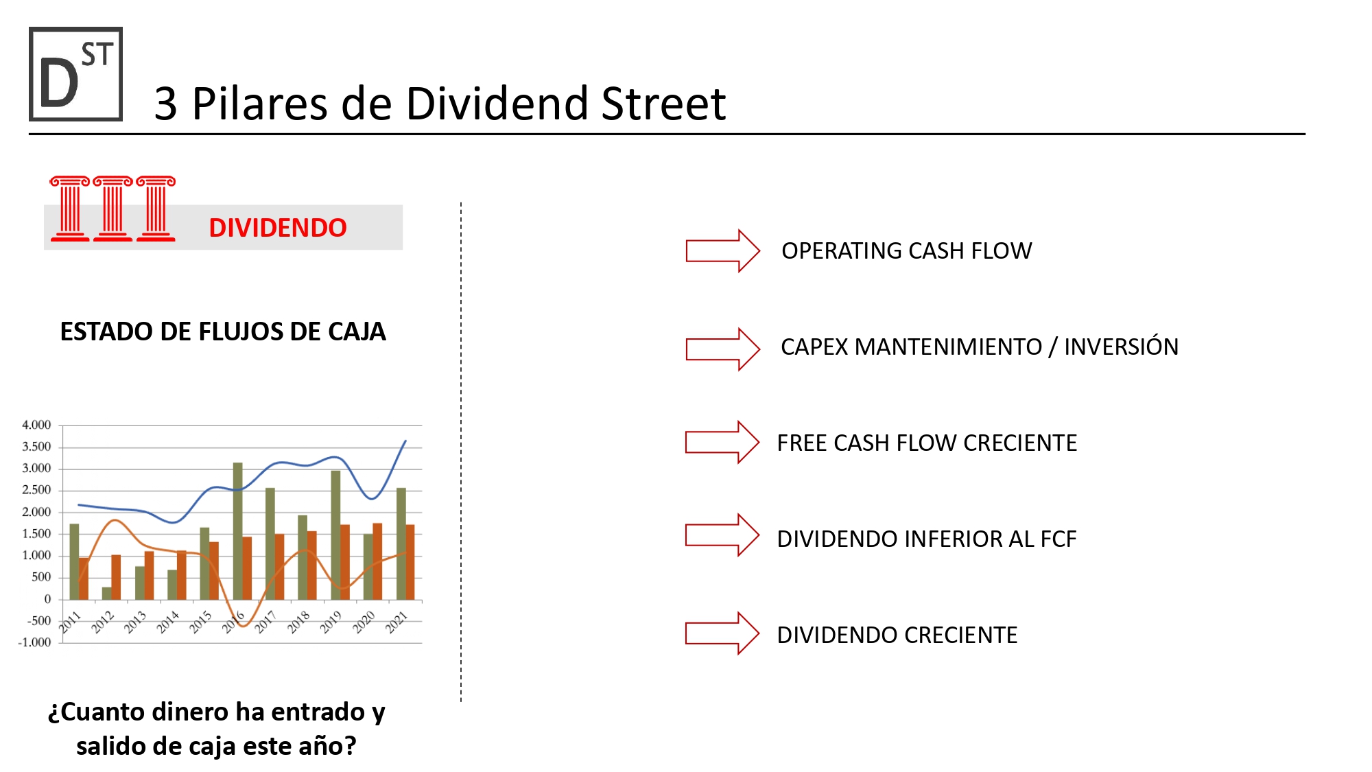 Por último, dado que nuestra estrategia se basa en ellos, nos fijamos mucho en el Dividendo que la empresa reparte. Queremos que sea alto y creciente pero, sobre todo, que sea sostenible. Y la mejor forma de validar esta sostenibilidad es comparándolo con el Free Cash Flow, que encontramos en el Estado de Flujos de Caja.