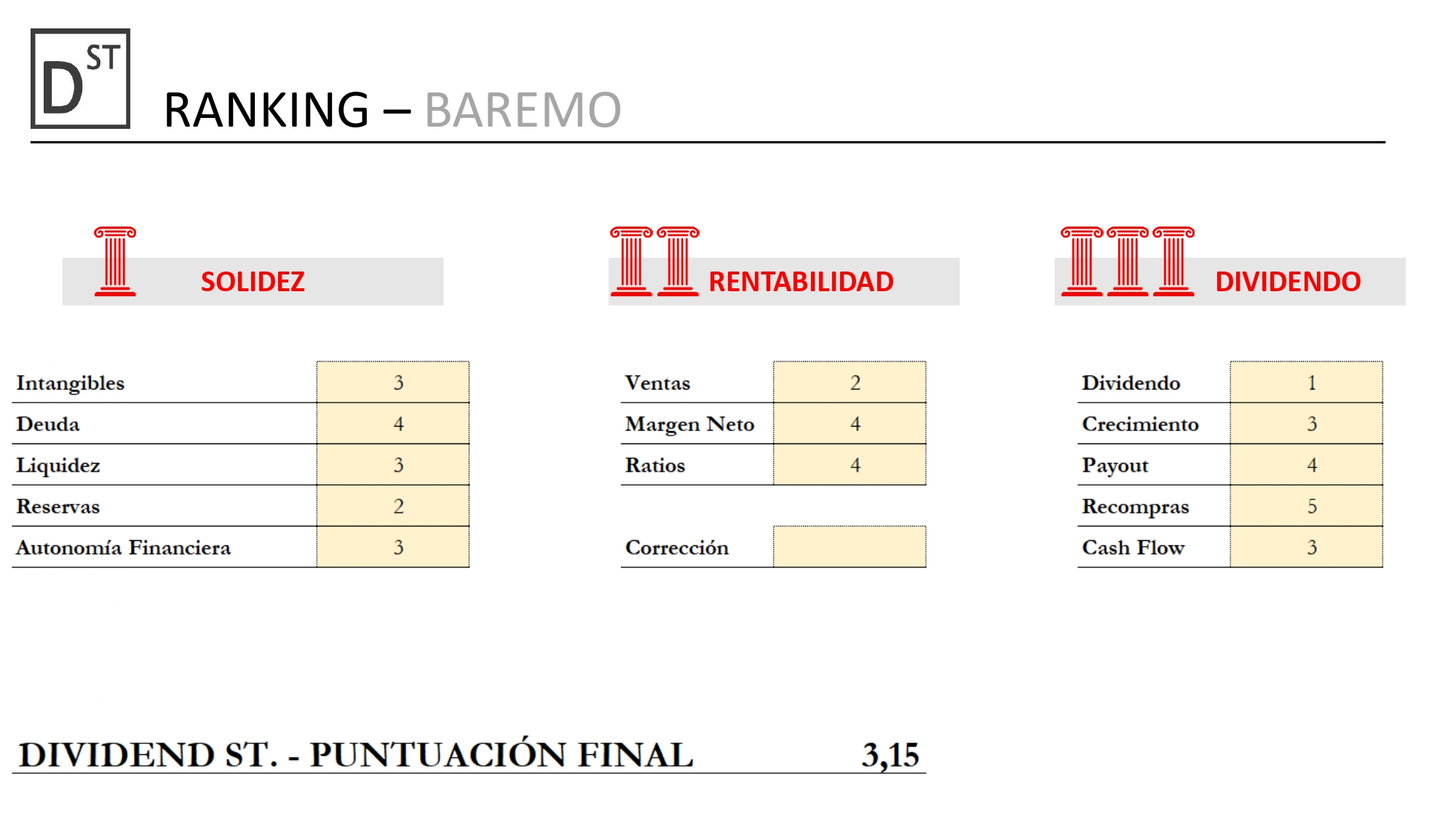 Estos 3 pilares, Solidez / Rentabilidad / Dividendo, nos permiten establecer un baremo, con el cual puntuamos sobre 5 todos los aspectos comentados anteriormente. Como es lógico, ninguna empresa es perfecta, y algunas puntúan más que otras en según y qué apartado. Es más, algunos puntos del Baremo suelen tener cierta simetría. Por ejemplo, una empresa que reparta habitualmente un alto Dividendo o haga muchas Recompras de Acciones es probable que tenga una Autonomía Financiera menor. Esto no siempre es así, pero lo que sí es verdaderamente extraordinario es encontrar empresas que puntúen bien en todos y cada uno de estos parámetros.