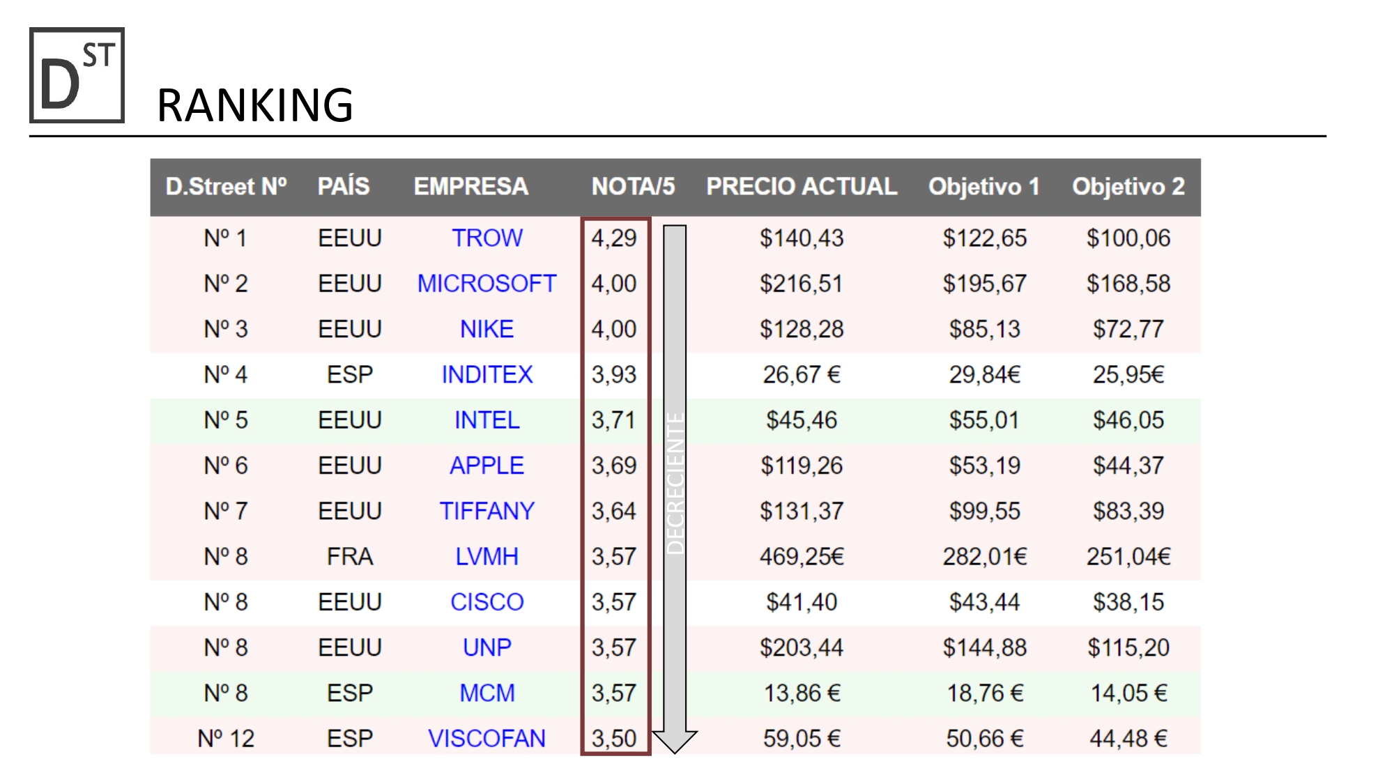 Y estas son precisamente las empresas que buscamos comprar. Cuando hacemos la media de todas estas puntuaciones, acabamos teniendo una nota final para cada empresa, y con ella las ordenamos de mejor a peor en nuestro Ranking. Así es como establecemos nuestras preferencias de compra. Tenderemos a comprar las empresas que estén lo más arriba posible en este Ranking.