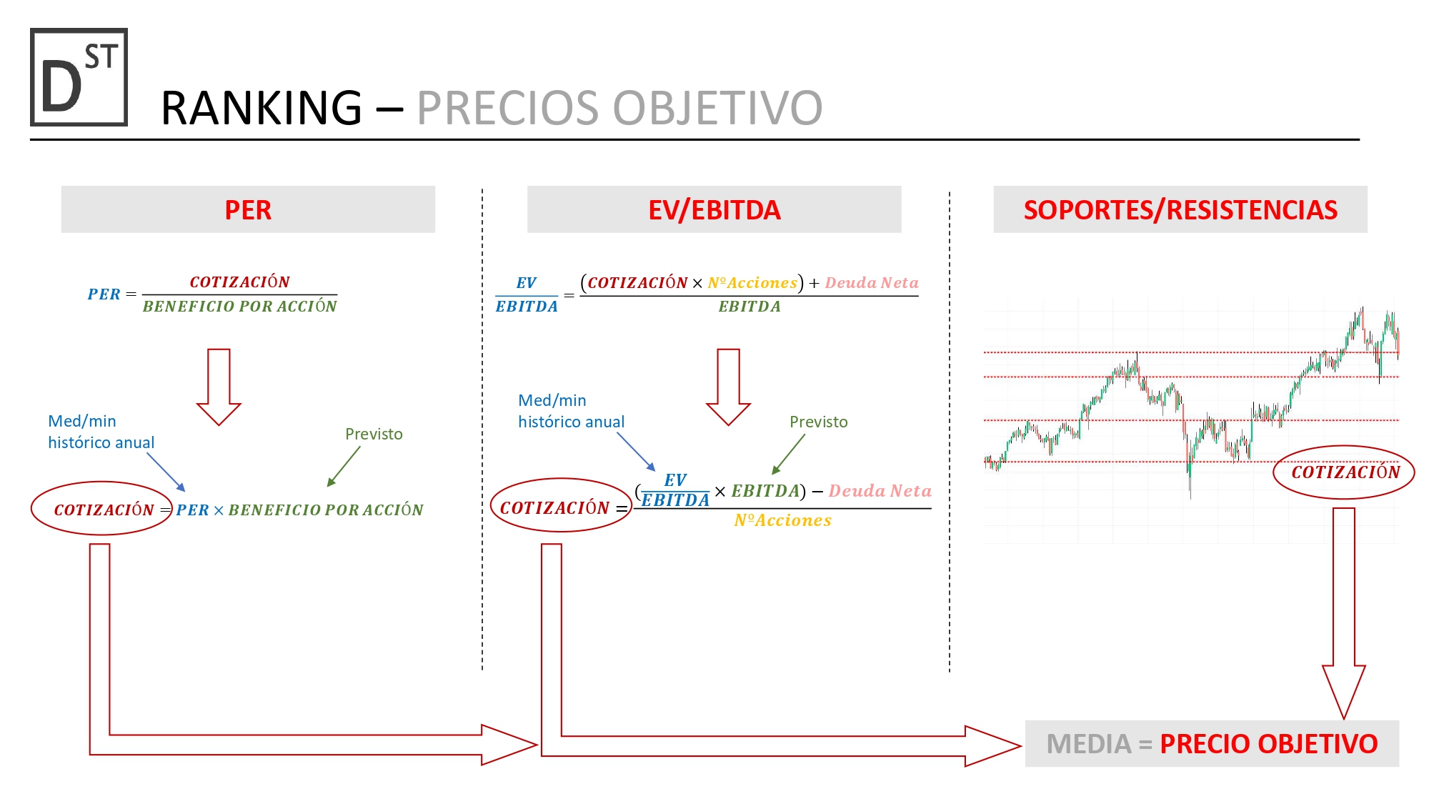 Por tanto, y volviendo a nuestro Ranking, ¿cómo lo utilizamos nosotros? Pues bien, procuramos comprar las empresas que están más arriba, y a poder ser, cuyas cotizaciones estén por debajo del primer precio objetivo histórico, o incluso del segundo. Cuando las cotizaciones suben por encima del primer precio objetivo, se nos resaltan en rojo, y procuramos no comprar. Si la cotización cae por debajo del segundo precio objetivo, la empresa se nos resalta en verde. Mientras la cotización se mantiene entre los dos precios históricos objetivo, la empresa se queda en blanco. Por tanto, procuramos comprar empresas que estén lo más arriba posible en el Ranking, y que estén en blanco o en verde.