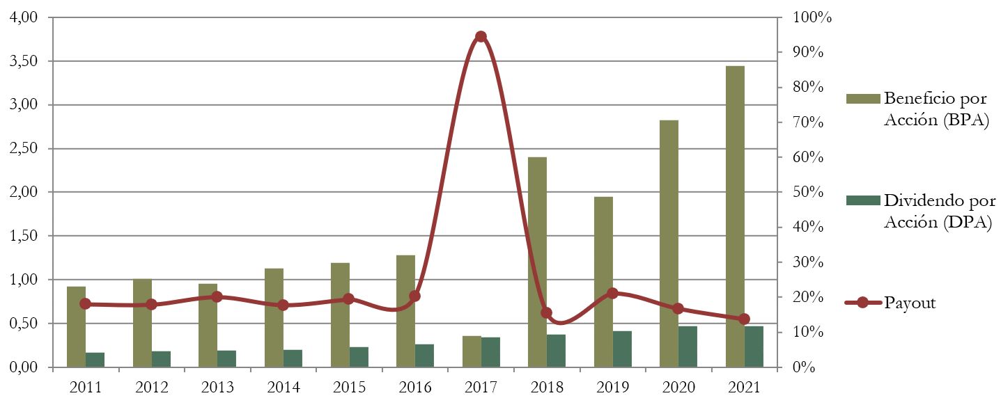 Si hubiéramos comprado en 2011 a $12, en 2021 nuestra Rentabilidad por Dividendo sería del 3,9%.