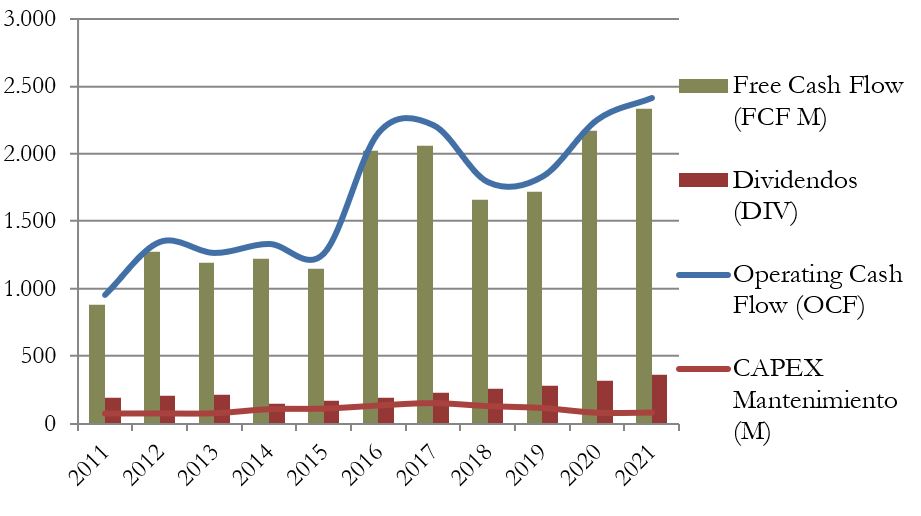 Pero lo más impresionante de todo es el poco CAPEX de Mantenimiento que necesita la compañía para generar semejante OCF. El CAPEX de Mantenimiento es tan bajo, que el Free Cash Flow es tremendamente alto y creciente. Además, los dividendos no significan más que una fracción (alrededor de un 15%) de este FCF.