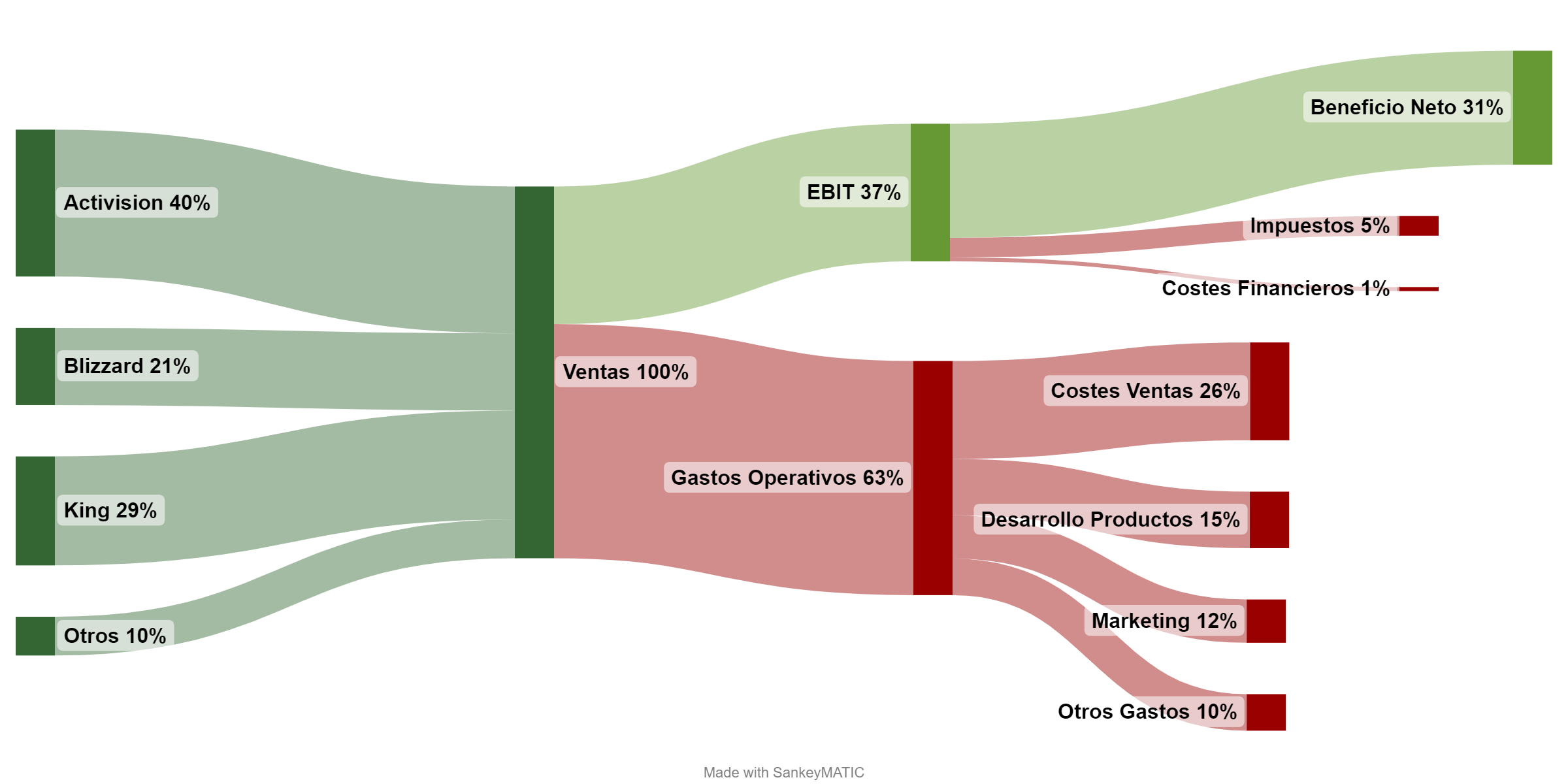 Además, las 3 divisiones (Activision, Blizzard y King) tienen todas muy buenos Márgenes Operativos, destacando Activision (Call of Duty) por encima de las demás con un 47%.