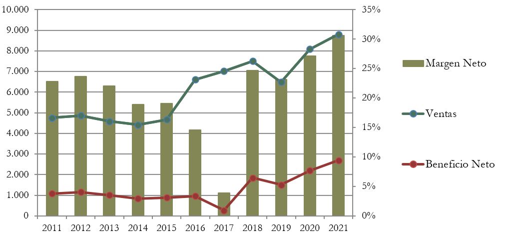 El Beneficio por Acción ha crecido todavía más que las Ventas: una media anual de más del 14% en la última década. Esto se explica en parte por la gran cantidad de Recompras de Acciones propias que ha hecho la empresa. En el gráfico se aprecia con claridad el efecto de la US Tax Reform Act de Donald Trump en 2017, y del efecto de la adquisición de King a partir de 2018.
