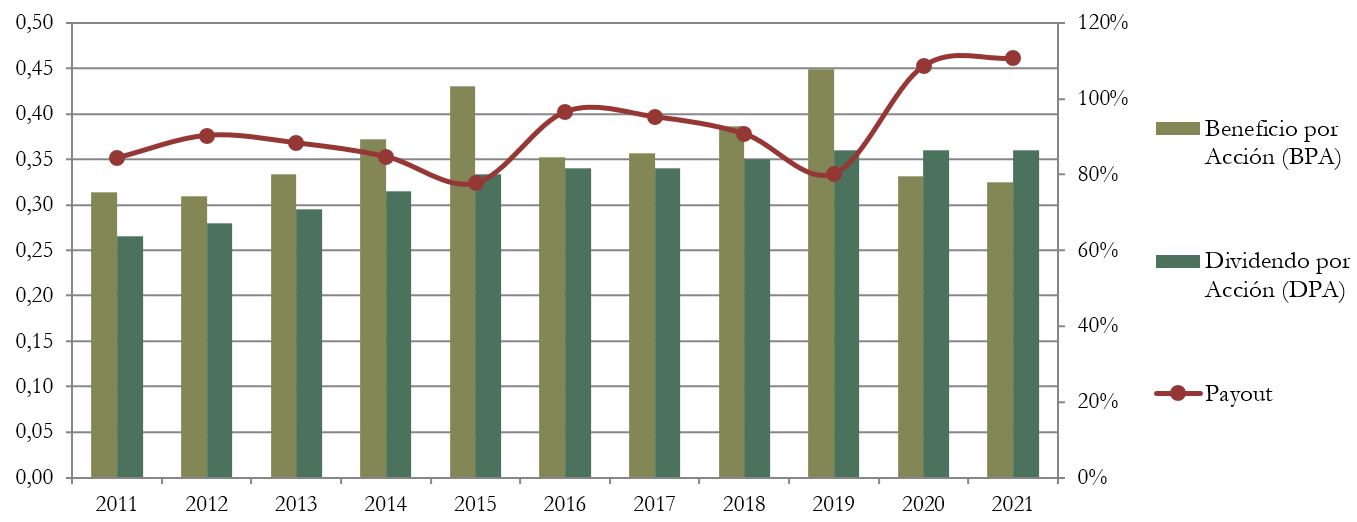 Como hemos visto anteriormente, el Payout es cercano al 100%, aunque los dos últimos años lo ha superado. En realidad, la empresa tiene la política de repartir en dividendos la práctica totalidad del Beneficio Neto, aunque intenta estabilizar los altibajos del BPA repartiendo un Dividendo más estable.