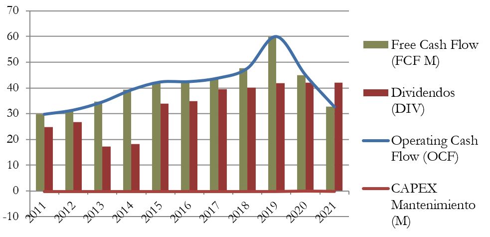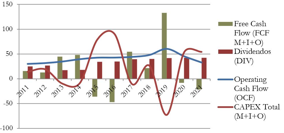 Si tenemos en cuenta el CAPEX Total (Mantenimiento + Inversión + Otros), se nos presenta un gráfico mucho más caótico. Esto es normal, puesto que la empresa tiene como actividad intrínseca comprar y vender acciones todos los años por importes superiores a lo que ingresa por Dividendos de las empresas que tiene en cartera. No debe preocuparnos en exceso esta volatilidad del FCF teniendo en cuenta las inversiones.
