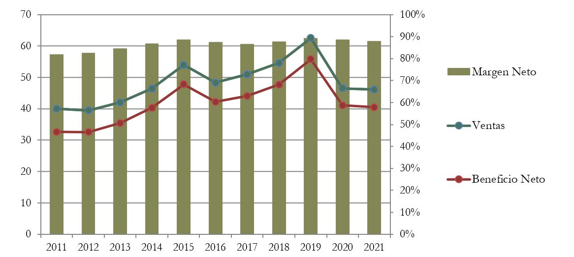 Por “Ventas” entendemos las rentas que tiene AUI principalmente mediante dividendos y dividendos extraordinarios de las compañías que tiene en cartera. Dado que este año ha habido reparto de varios dividendos extraordinarios de algunas empresas, la afectación de la crisis sanitaria se ha visto amortiguada: las Ventas han caído apenas un 0,9% respecto a 2020. Sin embargo, si no tenemos en cuenta estos dividendos extraordinarios, las Ventas hubieran caído un 17,5%.