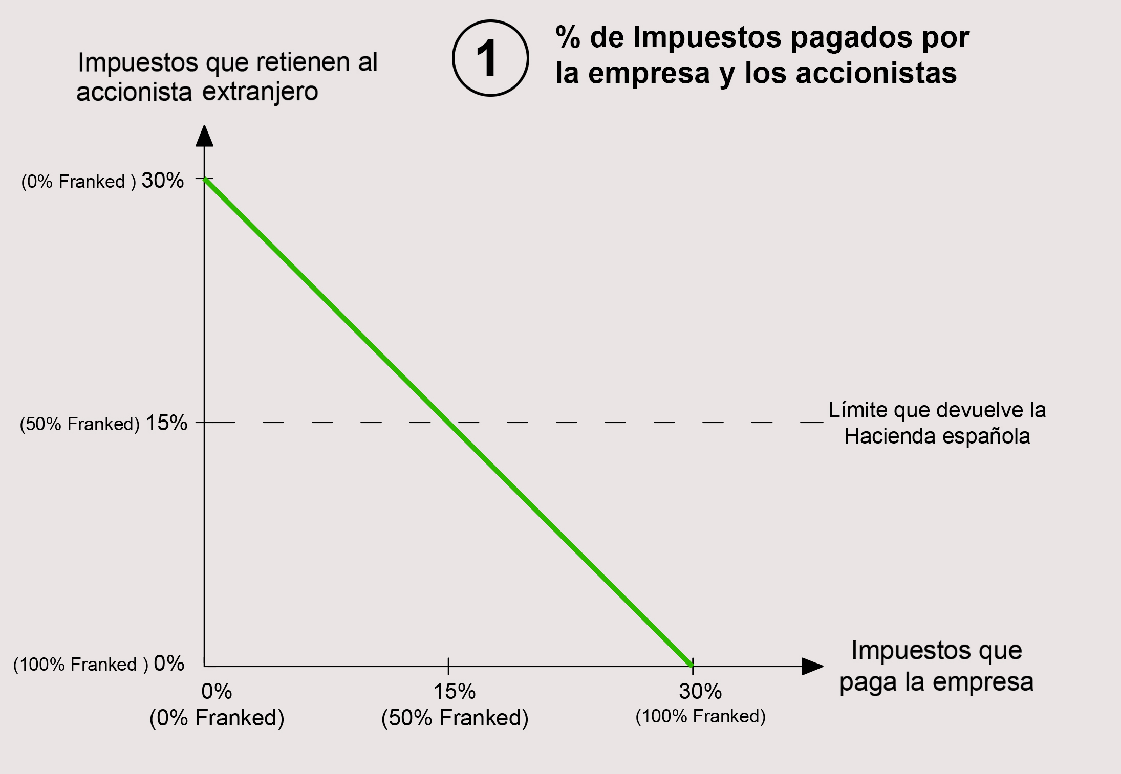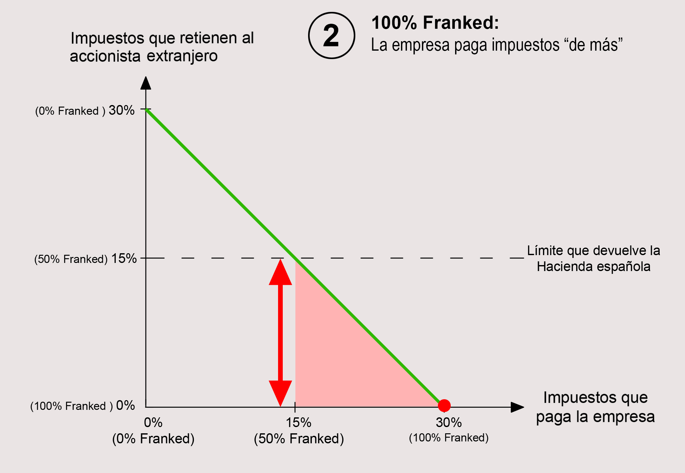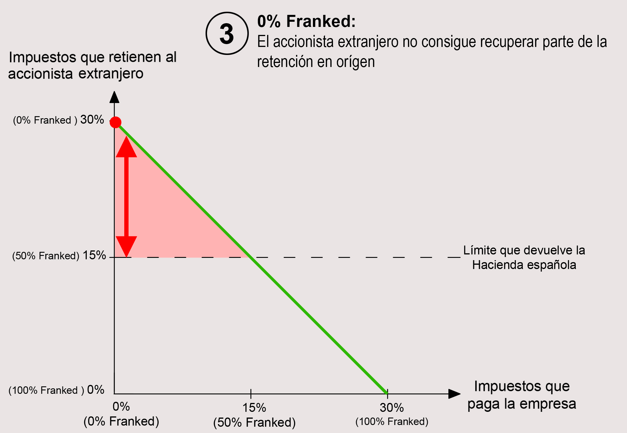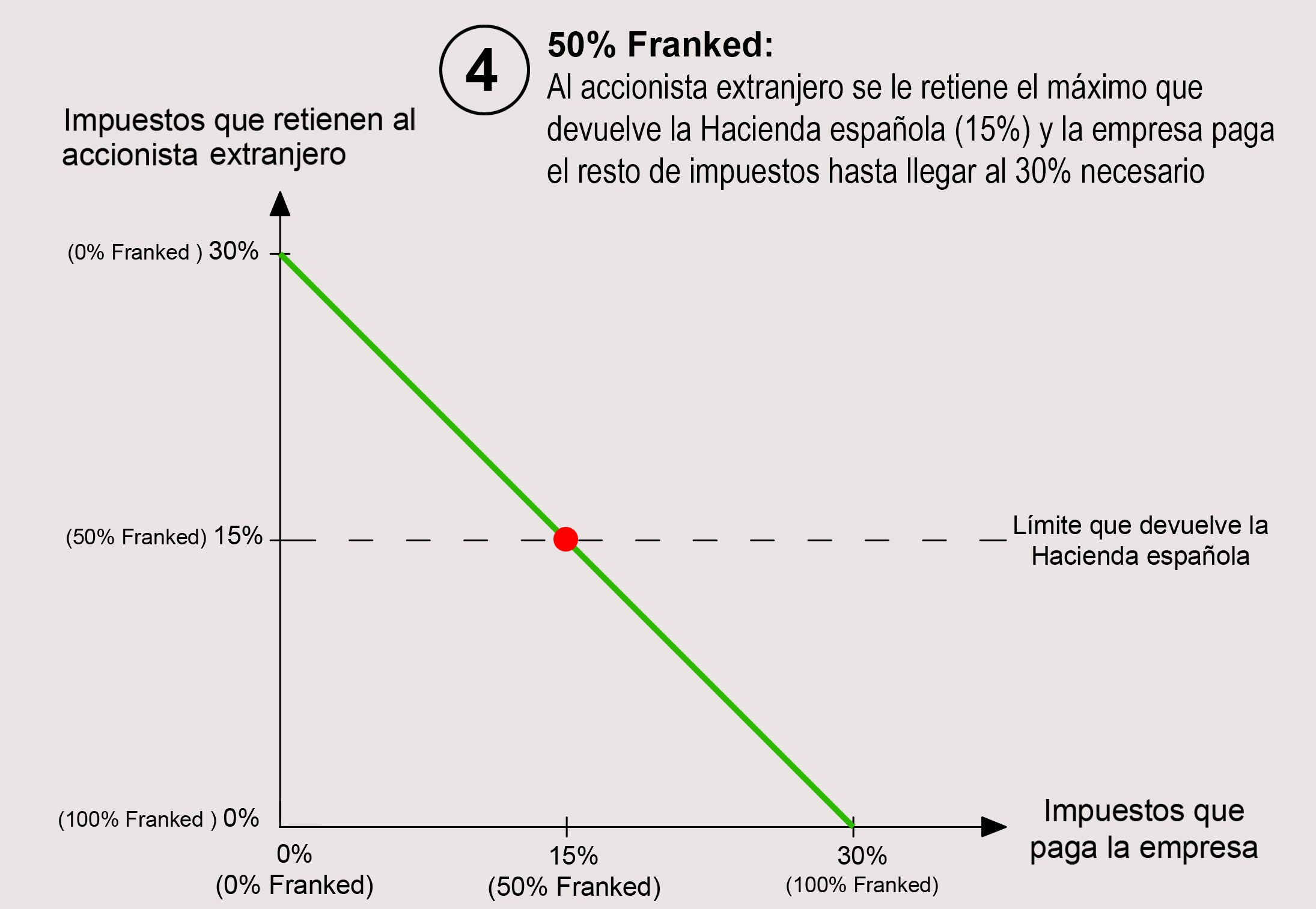 4) Podríamos decir que la situación fiscalmente óptima es la del dividendo “50% Franked” (o Franked at 15%”). En esta situación la empresa paga 15% y al accionista extranjero se le retiene un 15%, que es justo el máximo que devuelve la Hacienda española.