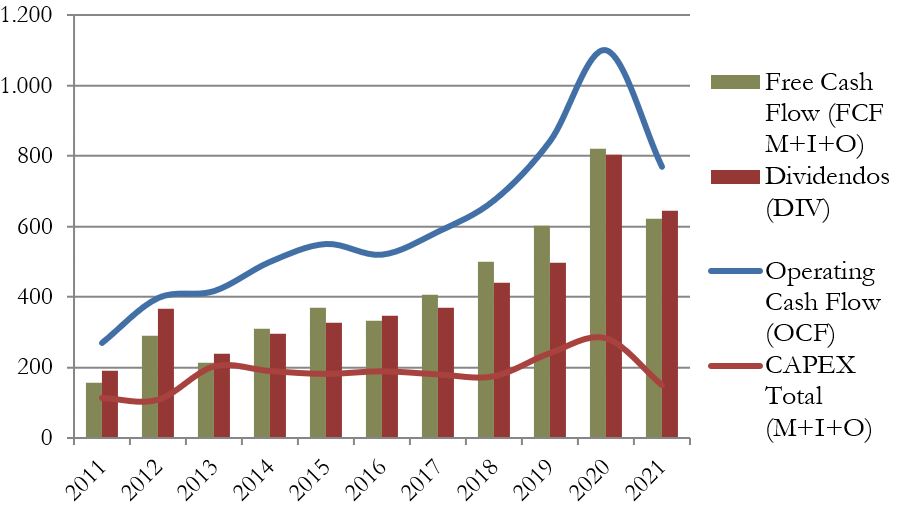 Por otra parte, vemos que el CAPEX de Mantenimiento es constante y que a pesar del crecimiento del OCF, el CAPEX no crece, y por tanto el Free Cash Flow es cada vez mayor.