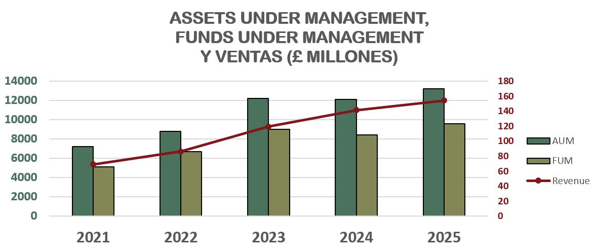 Además, en 2022, Foresight Group adquirió la división tecnológica de la gestora Downing por £13,6 millones, consiguiendo así la gestión de 3 fondos de Venture Capital con unos activos bajo gestión (AUM) de £275 millones. También, en 2023 Foresight Group compró la empresa Wellspring Finance Company Limited (£4,8 millones), que tiene contratos hasta mayo 2045 con el gobierno para levantar y gestionar capital para proyectos gubernamentales de infraestructuras locales (PFI projects). Por último, en marzo de 2025 Foresight Group adquirió WHEB Asset Management LLP (£1 millones), una gestora de fondos que invierte en empresas cotizadas de mediana capitalización con un enfoque de impacto sostenible. Esta última adquisición quiere reforzar el segmento FCM de la compañía, que detallaremos más adelante.