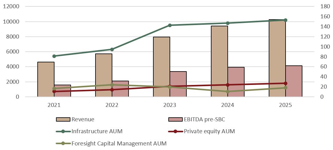 Además, Foresight Group Holdings no sólo está intentando crecer más en el segmento Private Equity (+29% de AUM entre 2023 y 2025), sino que está creciendo en proyectos con más rentabilidad. Por ello los incrementos entre 2023 y 2025 de las Ventas (+51%) y del EBITDA pre-SBC (+40%) se han disparado.
