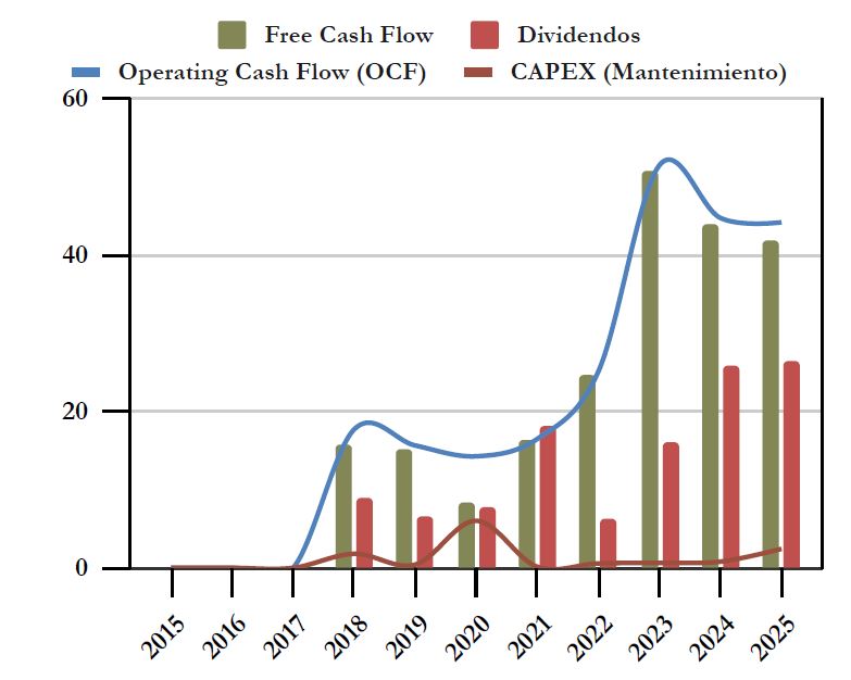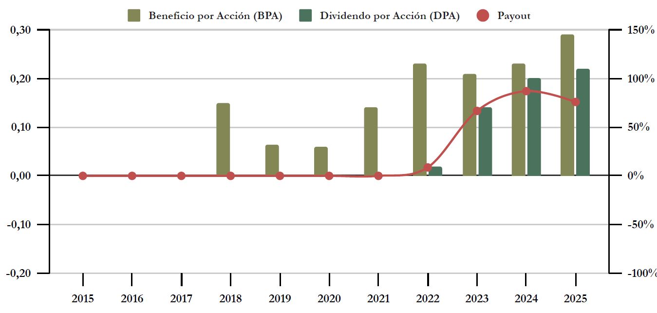Todavía es pronto para identificar tendencias muy marcadas en el gráfico de Cash Flows, pero sí que vemos que la generación de caja de la compañía es muy superior al dividendo distribuido, con lo que podemos afirmar que es muy sostenible. Sólo representa el 63% del Free Cash Flow en 2025, con lo que nos tranquiliza saber que a la empresa todavía le sobra un 37% de la generación de caja para realizar inversiones que permitan el crecimiento inorgánico de la compañía.