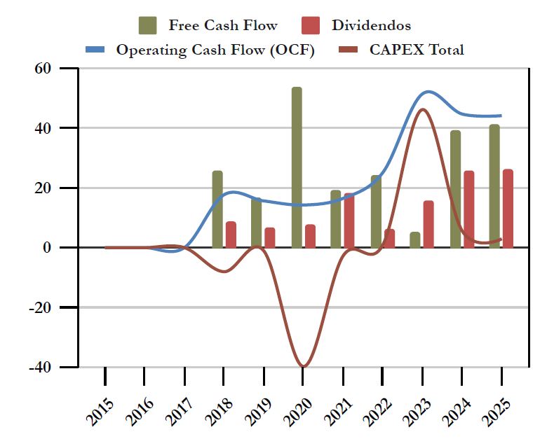Nada de qué preocuparse, puesto que exceptuando estos años el FCF es muy holgado para el pago de Dividendos, y la importante compra de ICP se justifica muy bien viendo el crecimiento del Operating Cash Flow en los años posteriores.