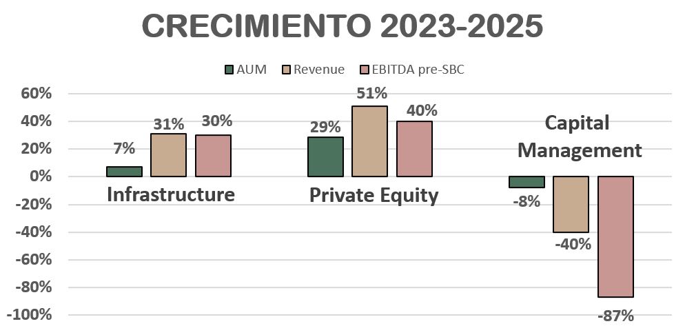 El segmento de Infrastructure también ha aumentado su rentabilidad, dado que habiendo crecido apenas un 7% en AUM, las Ventas y el EBITDA pre-SBC han aumentado un 31% y un 30% respectivamente. Un aumento de rentabilidad bastante notable.