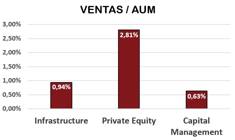 Esto también lo podemos apreciar en la relación entre las Ventas y los AUM de cada segmento, en dónde destaca mucho el segmento Private Equity. Sobre los activos gestionados (AUM), el segmento de Private Equity consigue cobrar unas comisiones cercanas al 3%, más que cuadruplicando al segmento Capital Management (0,63%) y triplicando las comisiones sobre AUM del segmento Infrastructure (0,94%).