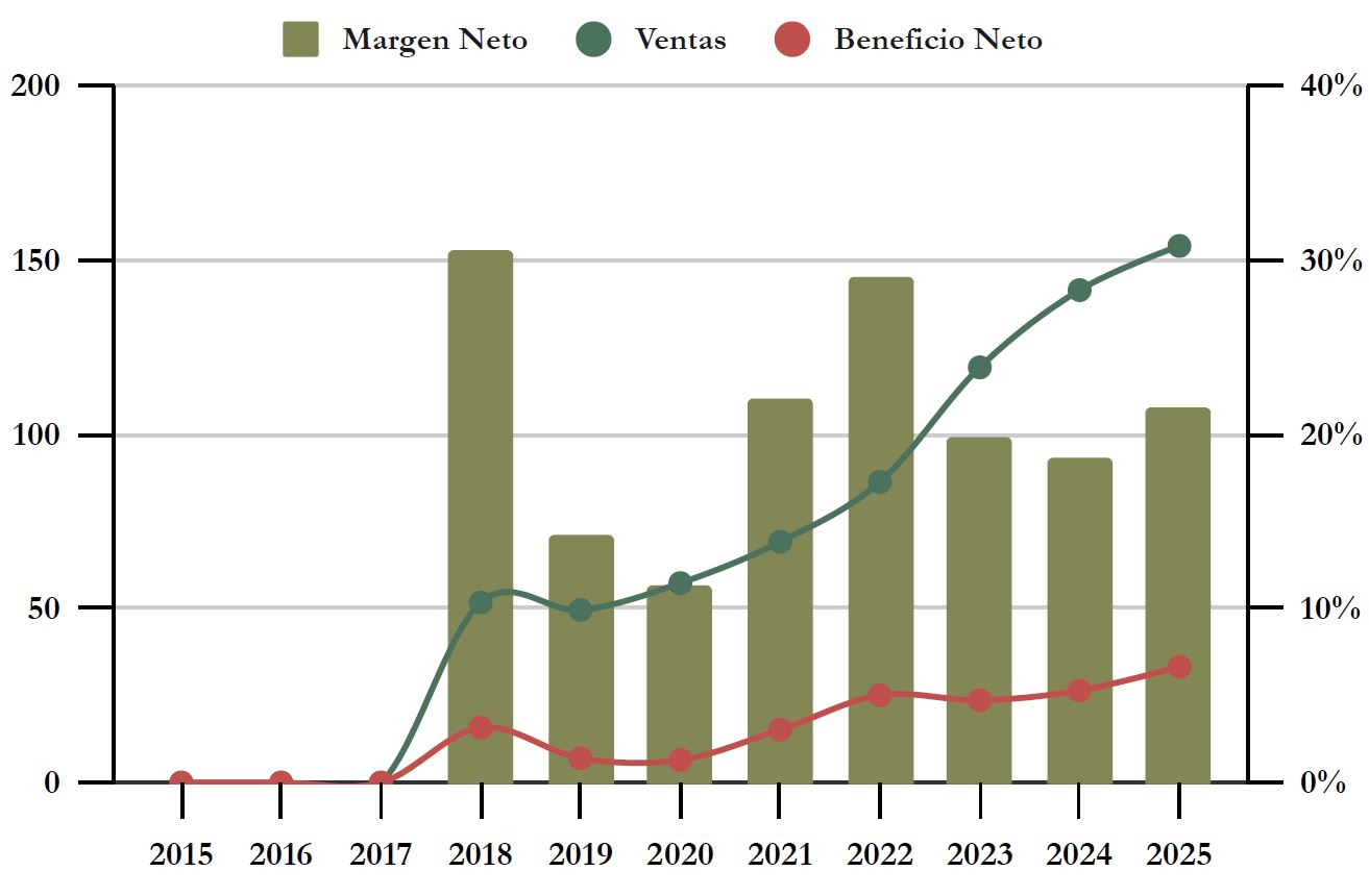 La evolución de las Ventas de FSG ha sido muy creciente, especialmente desde que la compañía salió a bolsa en 2021. Desde entonces ha crecido a una media del 22% anual desde que salió a cotizar en bolsa, un valor sin duda muy alto y propio de una joven empresa en expansión.
