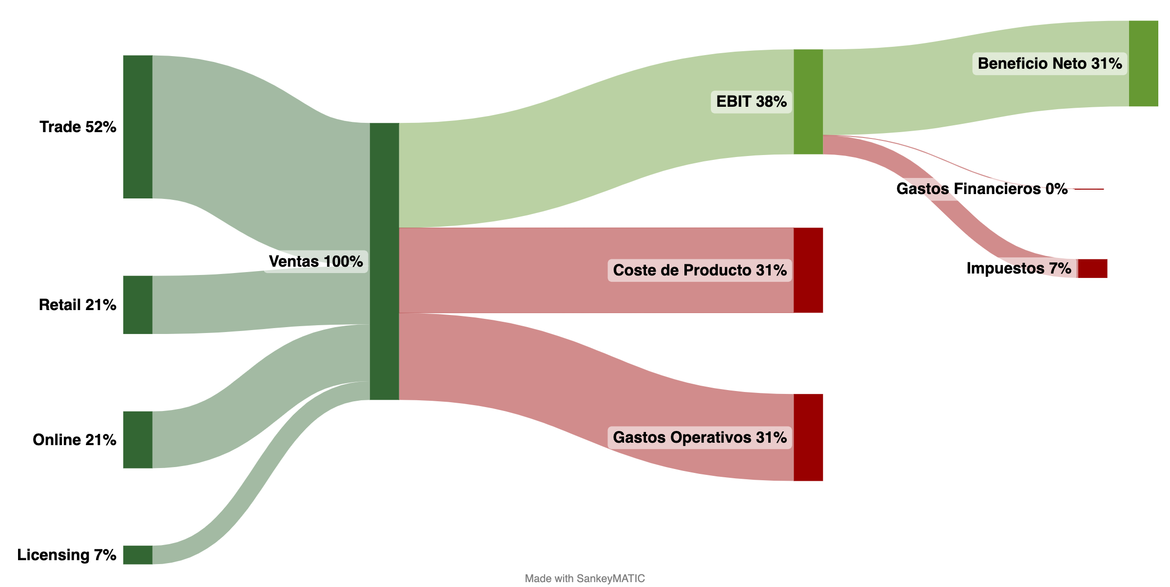 El segmento Core aun siendo menos rentable, tiene también unos márgenes muy altos que determinan las ventajas competitivas con las que cuenta Games Workshop. En el gráfico Sankey, se aprecia un negocio muy rentable.