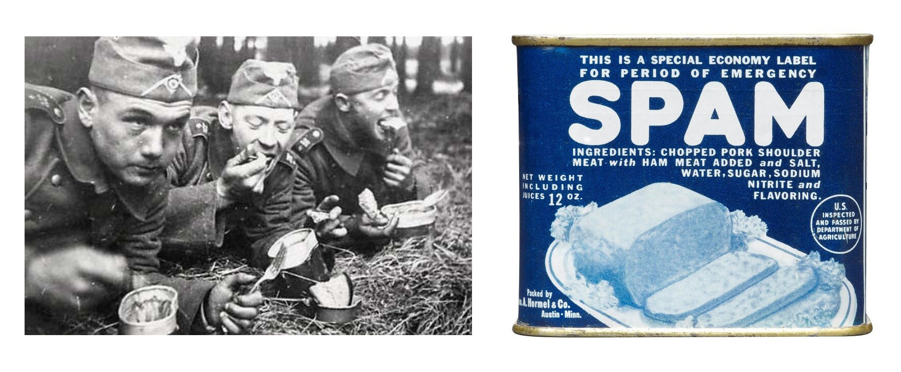 El SPAM, un fiambre especiado (Spiced Ham), se convirtió en el producto insignia de la empresa, ya que durante la Segunda Guerra Mundial Hormel Foods volvió a volcarse en el esfuerzo de guerra, hasta el punto en que más de la mitad de la producción de la empresa fue a parar a la US Army. El principal producto que se suministraba al ejército norteamericano era el SPAM, un tipo de jamón en conserva, que era muy práctico en los campos de batalla. Como ya hemos visto con otros productos como la Coca-Cola, el ejército americano hizo muy buena propaganda del producto, y se convirtió en la mejor campaña de marketing para la empresa aún tratándose de un producto que a menudo se usaba en bromas para referirse a comida “de batalla”.
