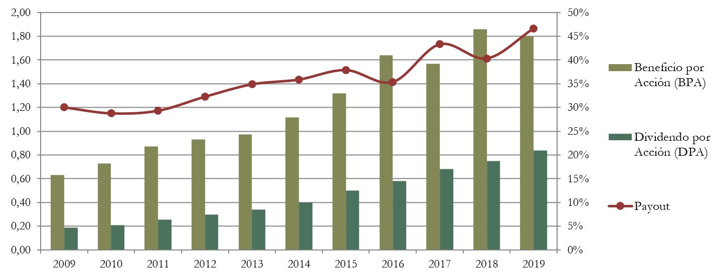 El Payout de Hormel Foods, aun siendo bajo, ha pasado de valores cercanos al 30% en 2009 a superar el 45% en 2019. Esto es señal que el Dividendo está creciendo más que el BPA y es algo que nos indica que el crecimiento del Dividendo es probable que se modere en los próximos años, a no ser que el BPA crezca de forma más acentuada. Será clave el éxito de la internacionalización de la empresa, para impulsar el BPA y poder seguir aumentando el Dividendo con un Payout moderado.