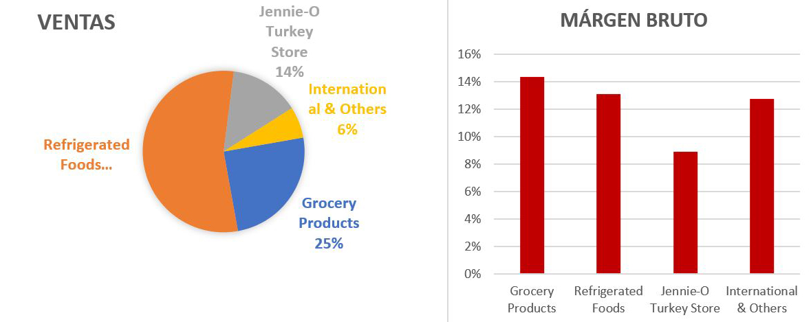 Además, como podemos ver en el gráfico a continuación, aunque la empresa depende bastante de su segmento “Refrigerated Foods” (venta de carne y pollo a minoristas y restauración), los segmentos que más Ventas tienen son los que ostentan mejores márgenes brutos. (“Grocery Products” y “Refrigerated Foods”)