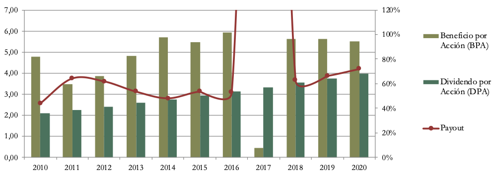 El Payout se situó en 2020 en un 72%, un valor que empieza a ser importante. Al incrementar más los dividendos que los beneficios, la tendencia del Payout es claramente ascendente. Y es que solía rondar el 60% anteriormente.