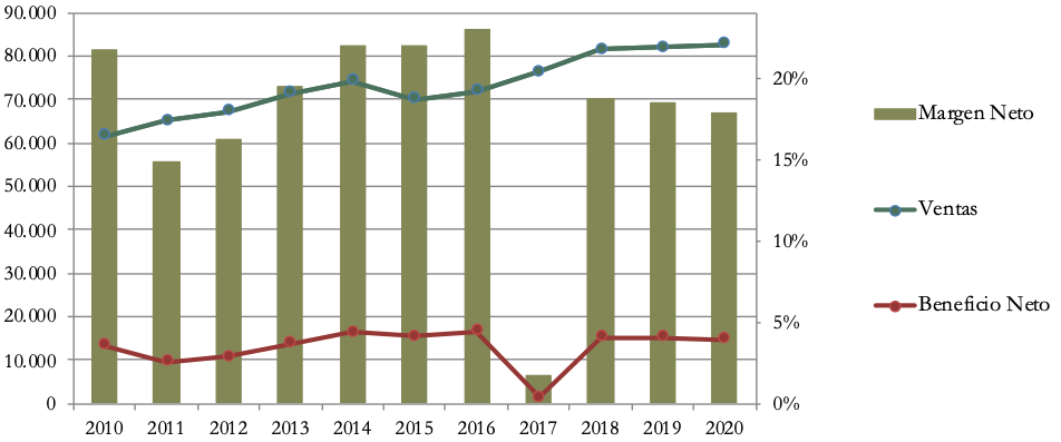En los últimos 10 años, las Ventas han crecido a una media del 3% anual. Un crecimiento moderado que parece estancado los últimos tres años.