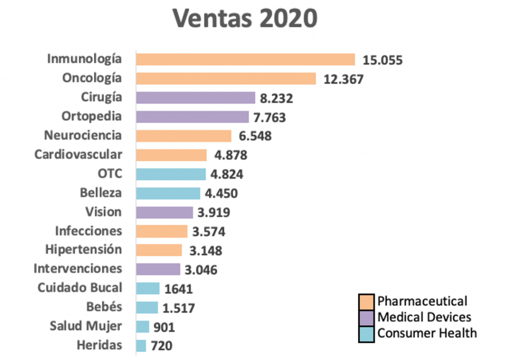 El sector que más contribuye y el que más crece es el de Pharmaceutical, donde el componente más importante es Inmunología, seguido por Oncología. Dentro de Inmunología se encuentra su medicamento estrella: STELARA (para el tratamiento de la psoriasis en placas), que representó en 2020 el 9,3% de las Ventas totales del Grupo. Las patentes de este medicamento expiran en 2023.