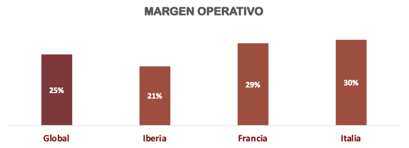 En cuanto a segmentos, la empresa no separa el coste de los aprovisionamientos por línea de negocio, por lo que no podemos comparar el Margen Operativo de Logista Pharma por ejemplo con el de Tabaco. Sin embargo, se entiende que el resto de actividades son algo menos rentables que la distribución de tabaco, ya que el Margen Operativo en el segmento Iberia es menor que el Margen en los segmentos de Italia y Francia, los cuales sólo distribuyen tabaco. Es obvio que la empresa necesita crecer en actividades diferentes al negocio del tabaco, pero se asume que ello conllevará una reducción de los márgenes.