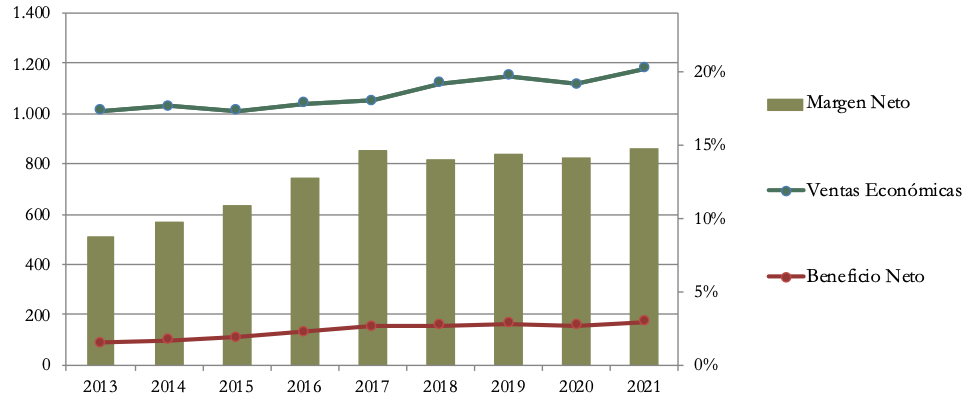 Las Ventas crecen a un ritmo medio del 2% anual. El último año han crecido un 5,6% compensando la ligera caída que tuvieron en 2020 debido a la Crisis Sanitaria, que no tuvo un impacto muy negativo, ya que la mayor parte del negocio de Logista no se vio afectado, al considerarse el tabaco un bien de primera necesidad.