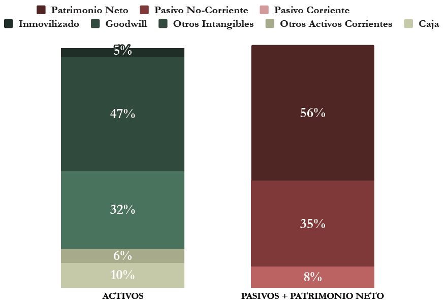 En cuanto al Goodwill, representa un 47% del Total Activos, un valor relativamente elevado, pero que tiene sentido en esta empresa, dado que la inmensa mayor parte es atribuible a la adquisición de Refinitiv en 2021. Este es un valor muy alto, que además va acompañado de un volumen también muy alto de Intangibles (32%), fruto también de la adquisición de Refinitiv.