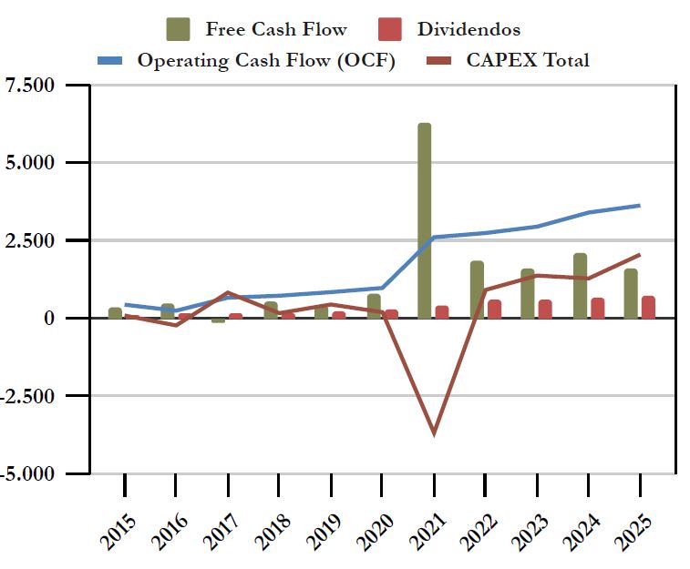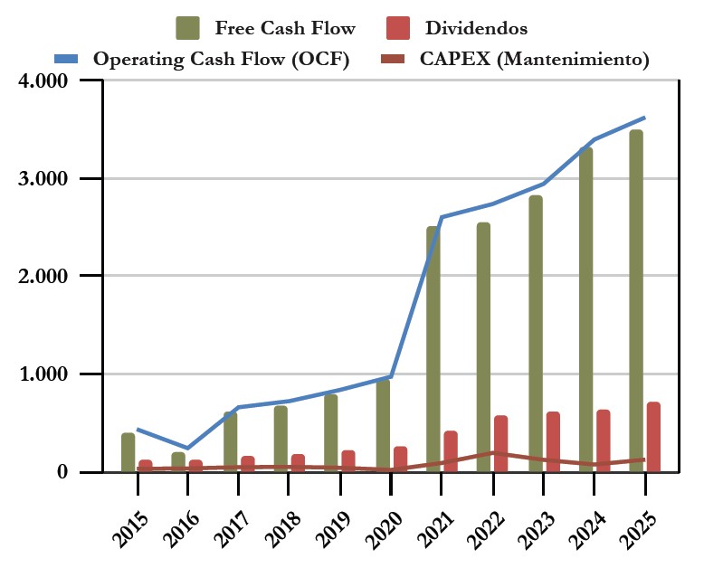 Sin embargo, el atractivo de la compañía reside en lo holgado que es este dividendo frente a su Free Cash Flow. Lo veremos un poco más adelante.