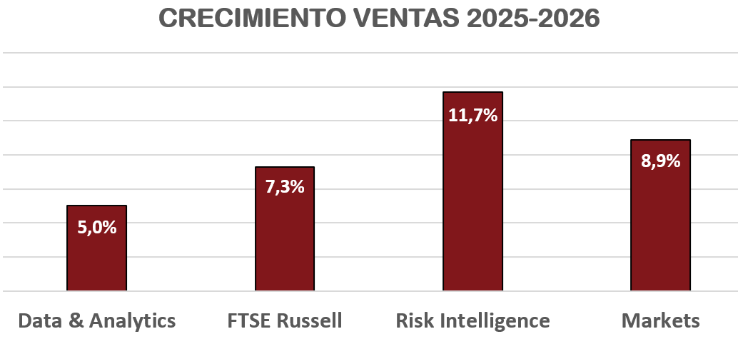 Como hemos visto ya en la introducción, las Ventas de LSEG se descomponen en 4 segmentos: Data & Analytics (47%), Risk Intelligence (6%), FTSE Russell (10%) y Markets (37%). Todos los segmentos crecen, y la buena noticia es que los que más crecen son precisamente los más rentables (Risk Intelligence, FTSE Russell y Markets):
