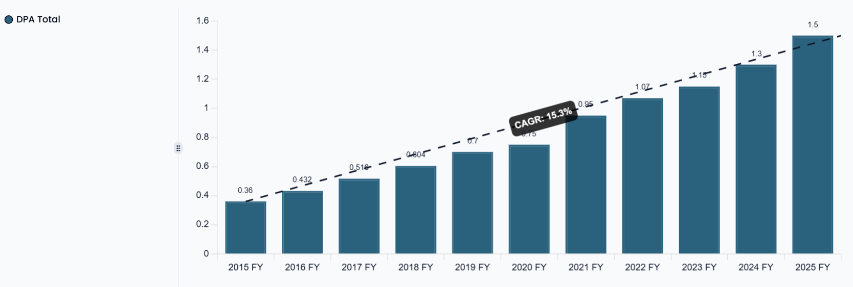 LSEG ha repartido de Dividendos de forma ininterrumpida desde su salida a bolsa en el año 2001. Además, ha sido creciente siempre excepto entre los años 2009 y 2010 y nunca se ha visto reducido, a pasar de pasar por crisis considerables como la crisis financiera, la Covid-19 o transformaciones muy relevantes, como la compra de Refninitiv en 2021. El crecimiento medio anual ha sido muy pronunciado durante la última década: 15,3%. Si nos vamos más atrás en el tiempo y miramos el crecimiento medio anual del dividendo en los últimos 20 años, este ha sido de un espectacular 17%. Además, este crecimiento no se ha ralentizado todavía, dado que en este último ejercicio el crecimiento ha sido del 15,4%.
