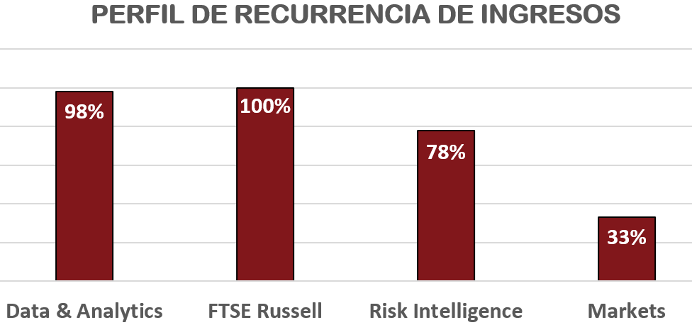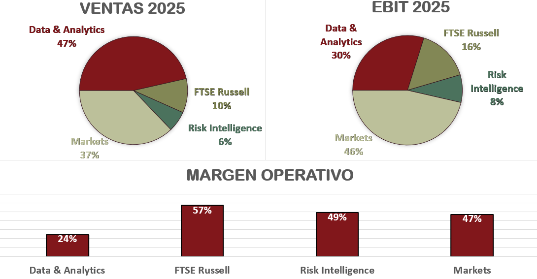 Por otra parte, cabe destacar como veíamos en la sección anterior que los segmentos que más crecen son los que mejor Margen Operativo tienen. Y en cuanto a margen operativo, los segmentos de alto margen Risk Intelligence, FTSE Russell y Markets representan un 70% del EBIT.