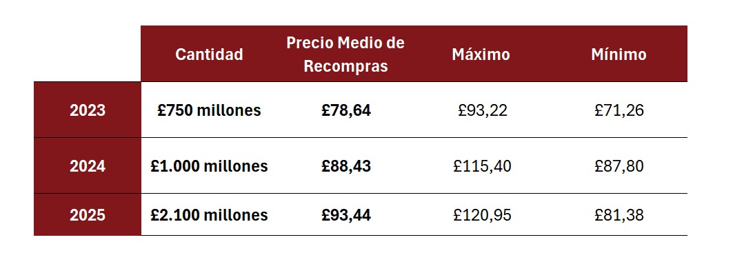 Este gráfico nos demuestra que antes de 2022 las recompras de acciones propias eran residuales. Sin embargo, en los últimos 3 ejercicios se ha convertido en la forma principal de retribución al accionista. Estos han sido los precios a los LSEG ha recomprado sus acciones propias en estos ejercicios:
