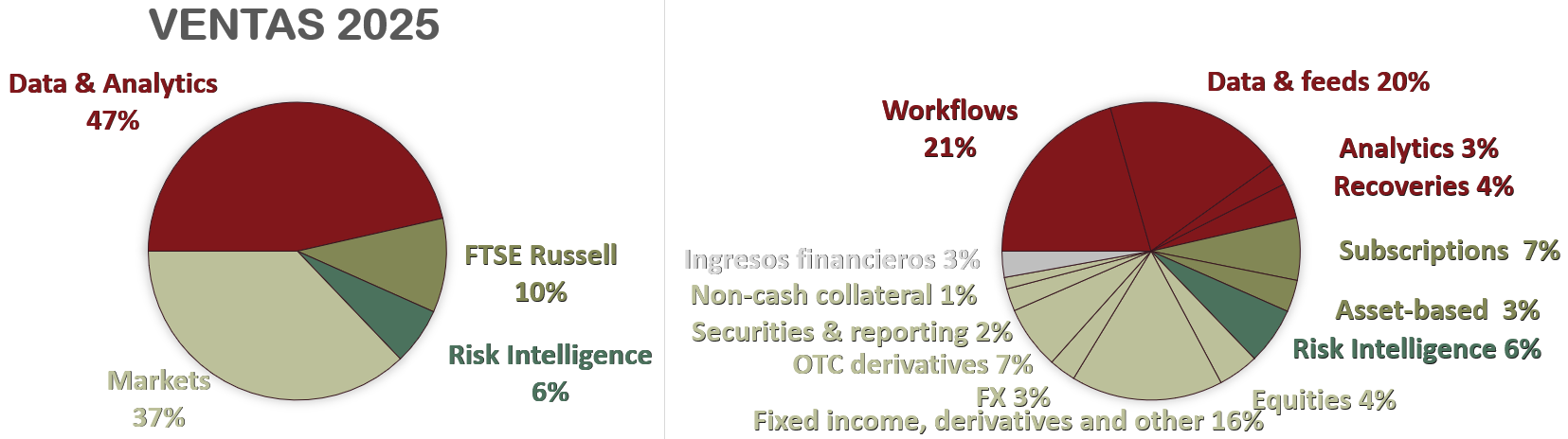 Para entender bien la composición de las Ventas de la compañía, veamos con detalle los cuatro segmentos estratégicos en los que LSEG divide sus operaciones, así como sus respectivos subsegmentos: