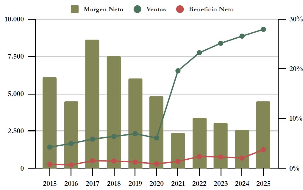 Lo primero que salta a la vista en el gráfico es el gran salto en las Ventas entre los ejercicios 2020 y el 2021, de nuevo fruto de la adquisición de Refinitiv. LSEG más que triplicó sus Ventas de un ejercicio al otro. Por ello, tenemos que separar el análisis de la tendencia en dos. Por una parte, el negocio antes de la adquisición, cuyas Ventas crecían a un excelente 13% anual (media entre 2015 y 2019), y por otra parte, después de la adquisición, donde siguen creciendo a un notable 6,35% (media entre 2022 y 2025).