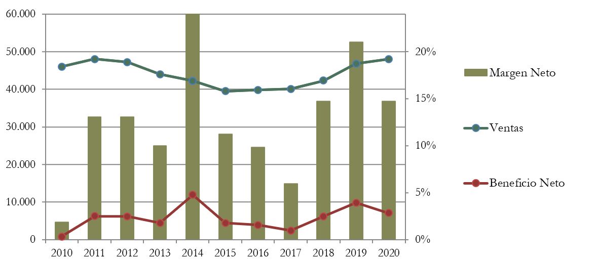 Las Ventas son bastante planas en la última década. En los últimos 3 años han sido crecientes, pero sólo para alcanzar valores de 2011.