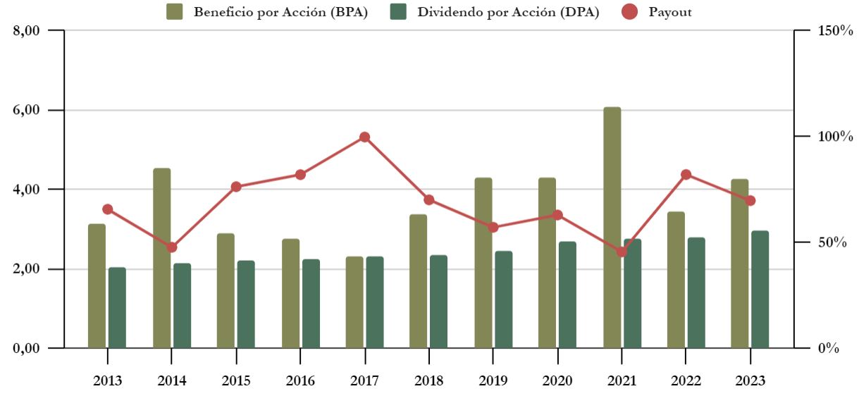 Sin embargo, este crecimiento del Dividendo es muy pequeño: apenas una media del 3,71% de incremento anual desde 2013. Pero también hay que decir que en Suiza apenas ha habido inflación en todo este periodo, y que el Franco Suizo (CHF) se ha revalorizado más de un 25% desde 2013. Por lo tanto, los accionistas antiguos europeos de Nestlé han tenido un retorno algo mejor de lo que parece a simple vista, con los dividendos en francos suizos que han ido cobrando a lo largo de los últimos años. En 2024, Nestlé ya ha anunciado un pago de 3,00CHF para este ejercicio, lo que supone un aumento del 1,7% respecto al año anterior.