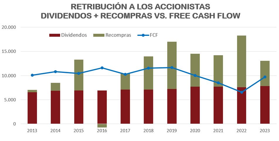 Pero lo más llamativo, es que Nestlé además recompra una cantidad muy importante de acciones propias. Po lo tanto, si sumamos los dividendos repartidos al importe de las acciones propias recompradas obtenemos el siguiente gráfico: