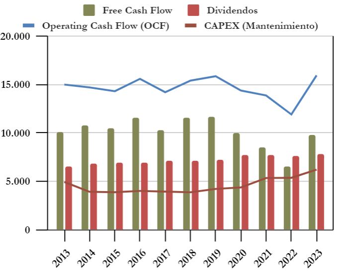 Además, desde aproximadamente 2018, el CAPEX de Mantenimiento crece de forma sostenida. Por lo tanto, el Free Cash Flow se ha contraído desde entonces, dado que el OCF se mantiene y el CAPEX de Mantenimiento crece. Esto es un problema, porque ha aumentado mucho el Payout respecto a su FCF: los Dividendos han pasado de representar un 62% del FCF en 2018, a un 80% en 2023.