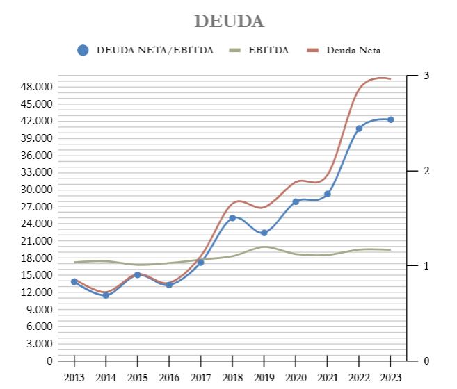Si nos fijamos en la Deuda Neta (línea roja), nos damos cuenta de que se ha más que cuadruplicado en la última década. Y aunque esto podría ser normal para una empresa de alto crecimiento, vemos que en el mismo periodo de tiempo el EBITDA se ha mantenido casi plano (línea verde). Por ello el ratio Deuda Neta/EBITDA (línea azul) ha pasado de valores razonables inferiores a 1 hasta 2017, a 2,54 veces en 2023.