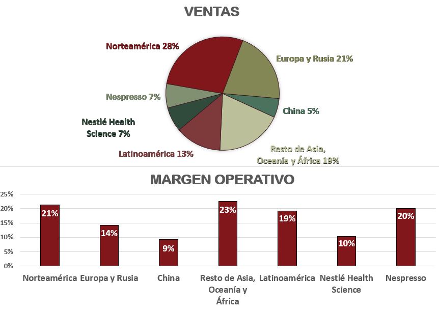 Otra forma que Nestlé tiene de reportar sus segmentos es en 5 zonas geográficas y 2 negocios gestionados a nivel global: Nespresso y Nestlé Health Science. Más adelante veremos en detalle por qué.