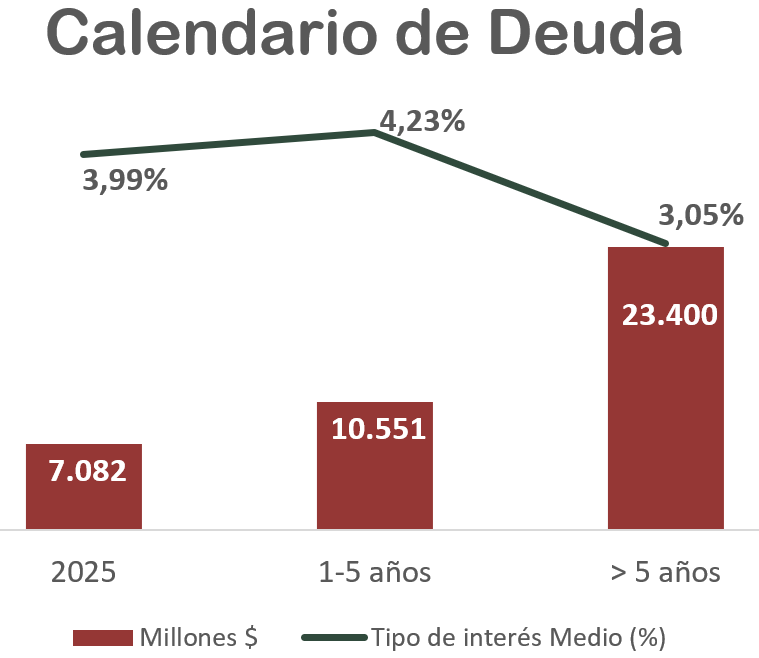 El tipo de interés medio de la deuda es del 3,51%, y los pagos por intereses representaron únicamente alrededor del 1% de las ventas en 2024. Además, el ratio de cobertura de intereses (EBIT/Intereses) es de aproximadamente 14,02, lo que demuestra que las ganancias antes de intereses e impuestos son suficientes para cubrir los intereses de la deuda 14 veces. Esto indica que la carga financiera no presenta un riesgo significativo en el corto plazo. Los intereses no parecen representar un riesgo para el negocio; el verdadero desafío radica en el monto que debe devolverse, especialmente si la empresa también desea pagar dividendos.